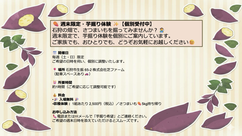 9月下旬より10月下旬までの土日にさつまいもの収穫体験をしてみませんか?